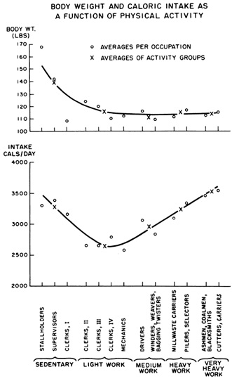 A study published in 1956 in The American Journal of Clinical Nutrition looked to see how physical activity affects calorie intake. The researchers selected 213 healthy male laborers from a mill in India who were all roughly the same height. All men were from India.Based on their occupation, all of the subjects were placed into one of five activity groups: Inactive, light work, medium work, heavy work, and very heavy work. Each of the men engaged in one of 16 occupations, each of which required different levels of physical activity.